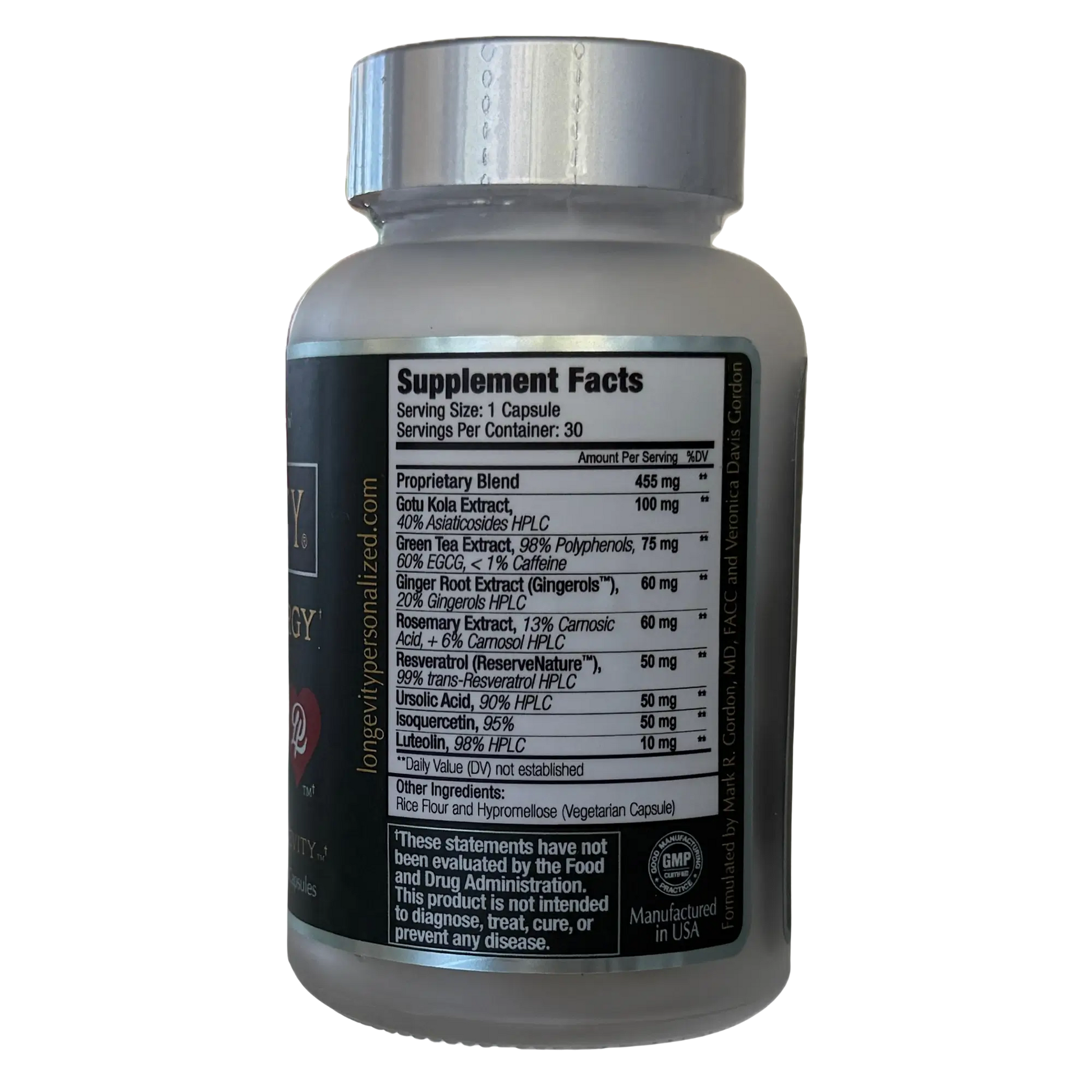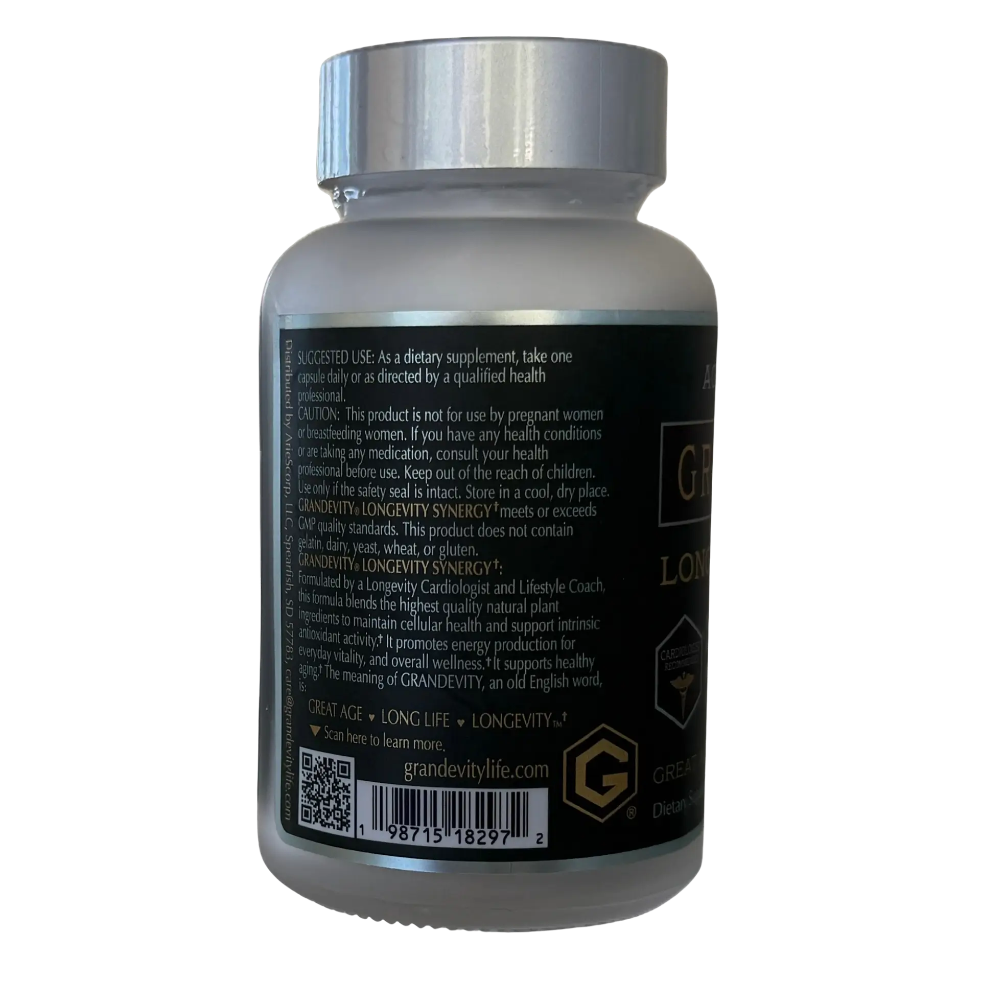 GRANDEVITY LONGEVITY SYNERGY is a meticulously crafted supplement designed to promote vibrant health and combat aging by targeting the 12 Hallmarks of Aging. Its powerful blend of natural ingredients—Gotu Kola for cognitive enhancement and telomere protection, Green Tea’s polyphenols and EGCG for metabolism and oxidative stress reduction, Ginger and Rosemary for digestion and antioxidant support, Trans-resveratrol and Ursolic Acid for cardiovascular health and cellular regulation, and Isoquercetin and Luteolin for anti-inflammatory benefits—works synergistically to enhance cellular renewal, boost vitality, and support overall well-being. By addressing key aging processes, LONGEVITY SYNERGY empowers you to live a longer, healthier life.